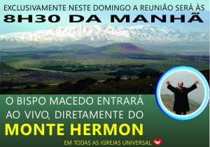Exclusivamente, neste domingo (13), em todo o Brasil, a reunião se iniciará às 8h30 da manhã. Por volta das 9h, o bispo Edir Macedo entrará ao vivo, por videoconferência, direto do Monte Hermom, em Israel, para anunciar a GRANDE REVELAÇÃO que Deus tem lhe dado e ministrar o DERRAMAMENTO DO ESPÍRITO SANTO.