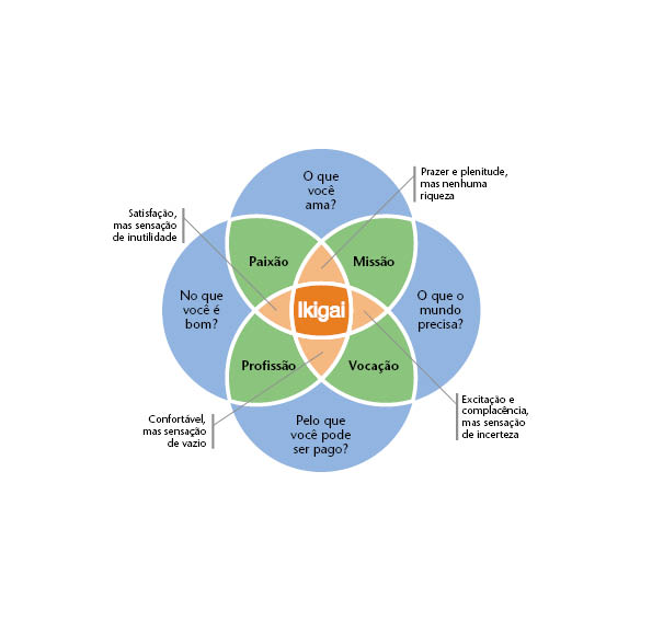 O consultor Ahlex Van der All sugere usar o Ikigai, um conceito que surgiu na Ilha de Okinawa, no sul do Japão, para descobrir os seus talentos. Na palavra Ikigai, iki significa vida e gai a realização de desejos e expectativas. De acordo com os japoneses, todos têm um Ikigai. Para conhecer o seu, responda às questões abaixo: